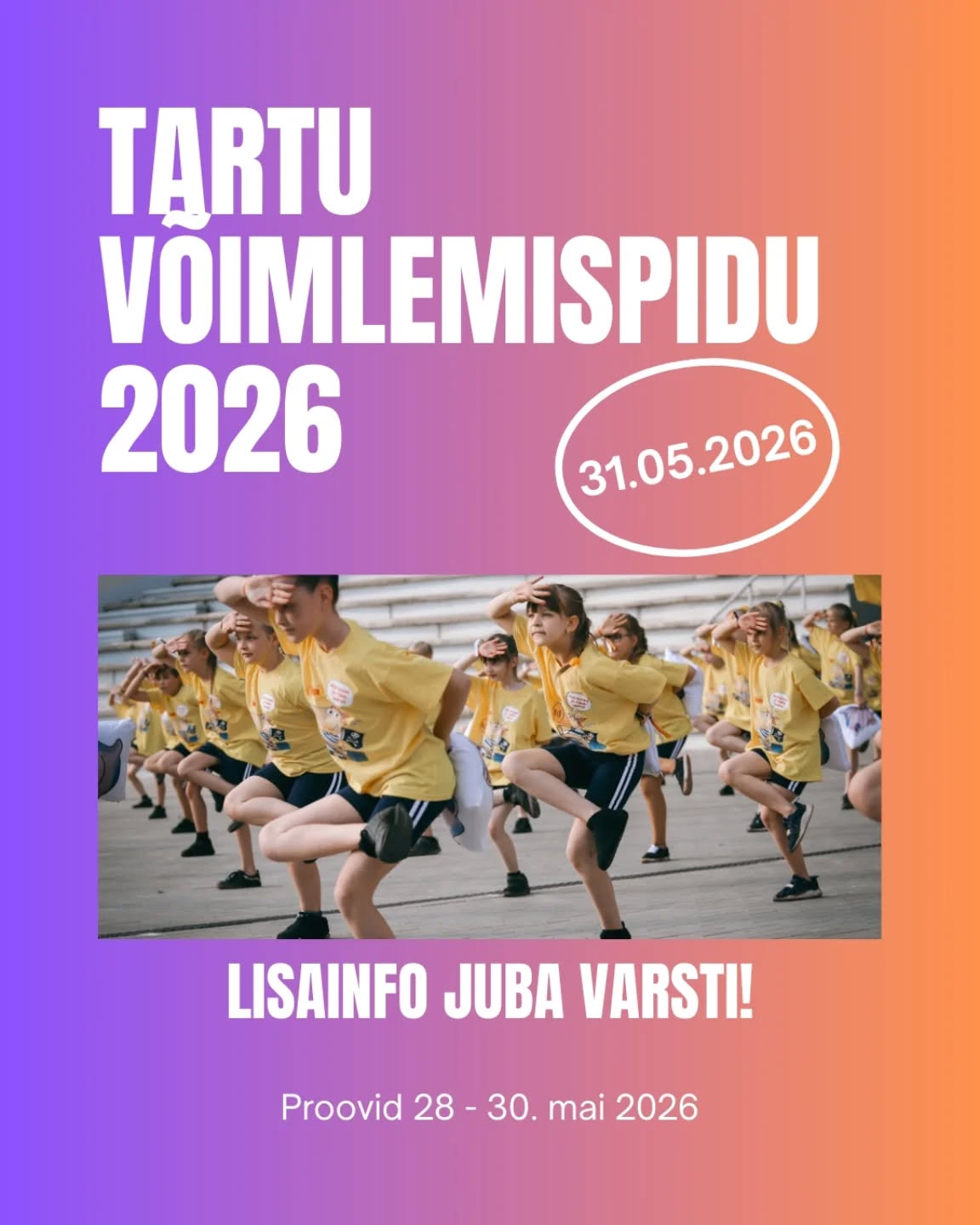 Tartu Võimlemispidu “Õnneks on võimlemine” Sündmuse toimumine: 31 mai 2026 Õnneks on liikumine. Õnneks on meie inimesed. “ÕNNEKS ON VÕIMLEMINE!” Täpsem info leitav siit.